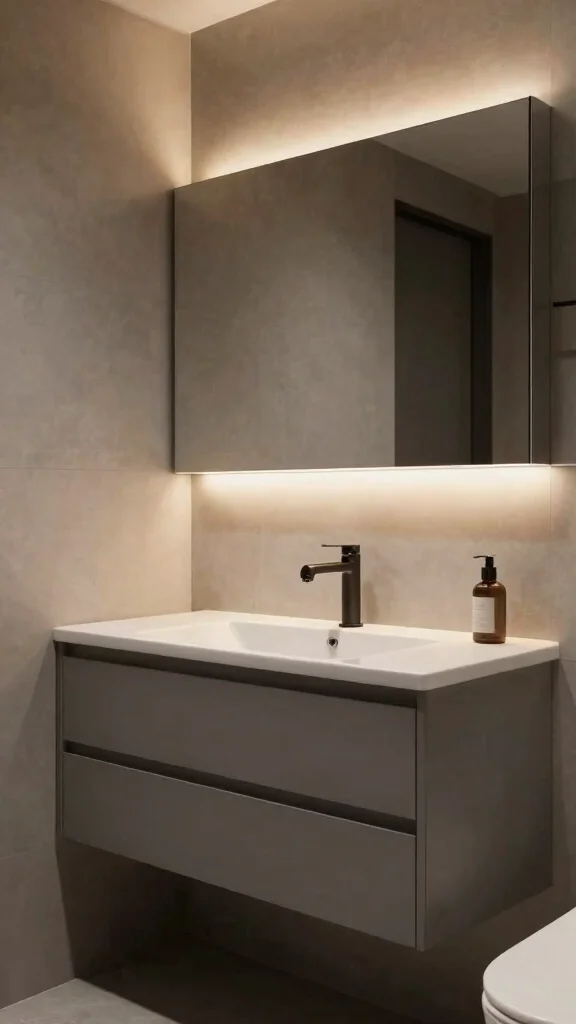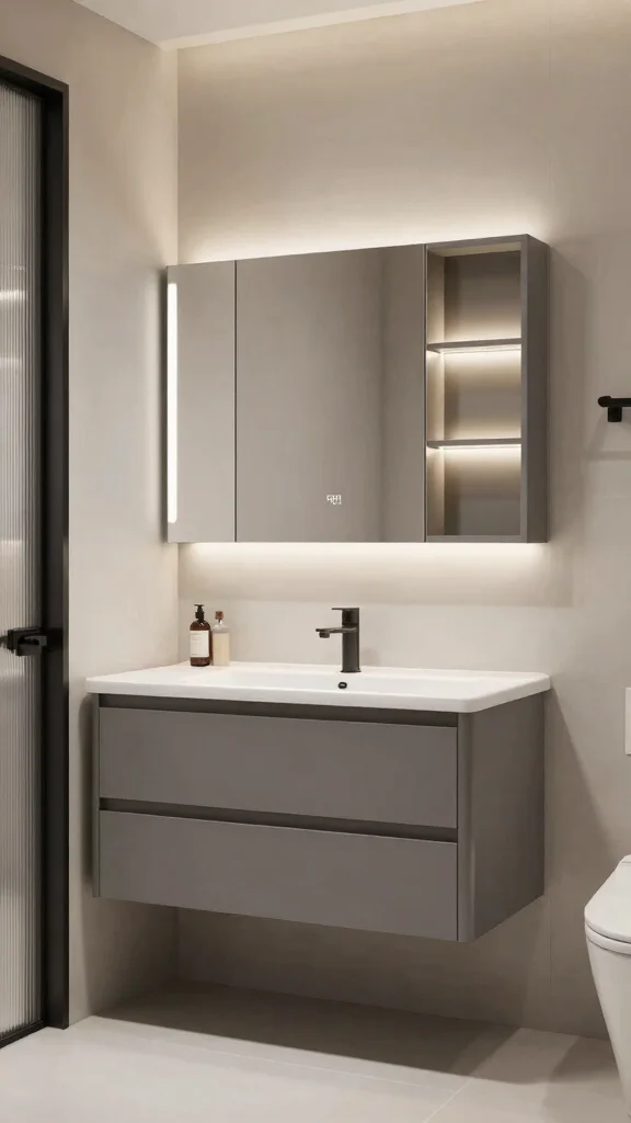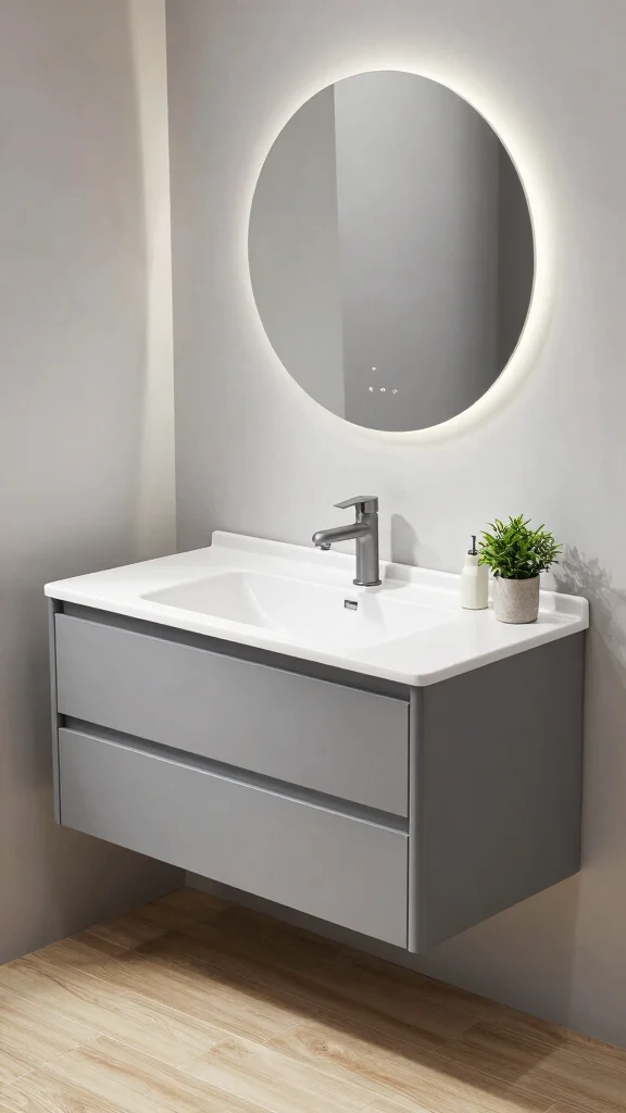 Floating or wall-mounted vanities in soft to mid-gray complement neutral color schemes and bounce light around the room. Choose contemporary vanity designs with slab doors or handleless profiles for a sleek modern bathroom decor vibe. Pair with warm LED lighting or layered fixtures to avoid a cold feel, and consider quartz countertops for durability. This combination keeps your space bright, calm, and stylish.