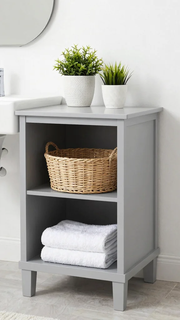A gray vanity featuring open shelving offers a stylish and functional solution for any bathroom. This design allows for easy access to essentials while showcasing beautiful decor items or plants. Open shelves help to minimize clutter and create a spacious feel, making it suitable for both small and large bathrooms. When choosing this style, ensure you balance storage needs without sacrificing aesthetics.