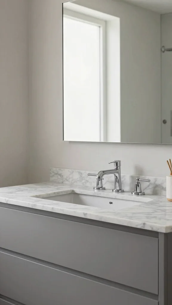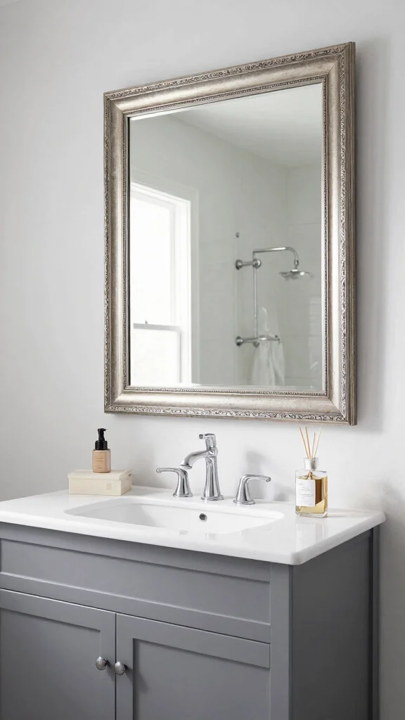 Pairing a gray vanity with a statement mirror can instantly elevate your bathroom’s design. Selecting a large, decorative mirror creates a stunning focal point that reflects light and adds depth to the space. The mirror’s style can either complement or contrast with the gray of the vanity, depending on your aesthetic preference.