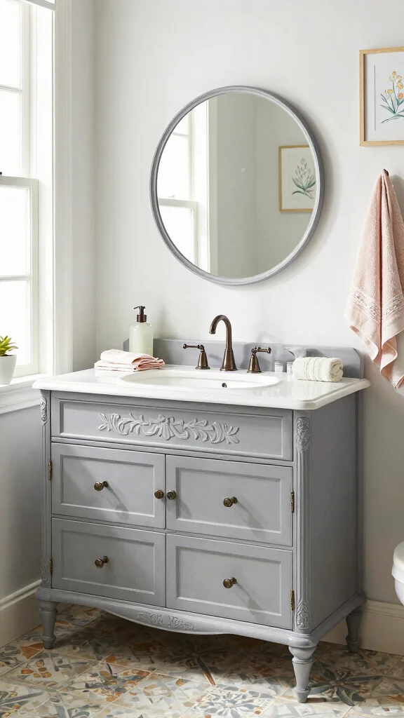 There’s something about a vintage gray vanity that makes a bathroom feel timeless and calm. Sustainable design can be chic—pair carved details with a bold mirror, and your gray bathroom vanity becomes a cohesive, elegant retreat.