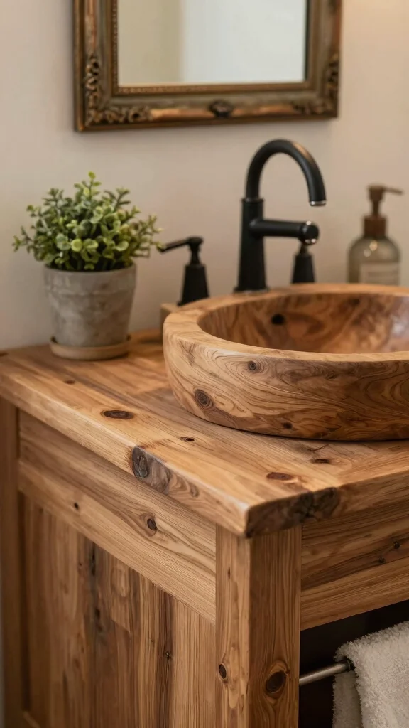 Enhance your wood tones with complementary materials like stone or ceramic to ground the design. Surround your vanity with candles, plants, and decorative stones to create an inviting ambiance.