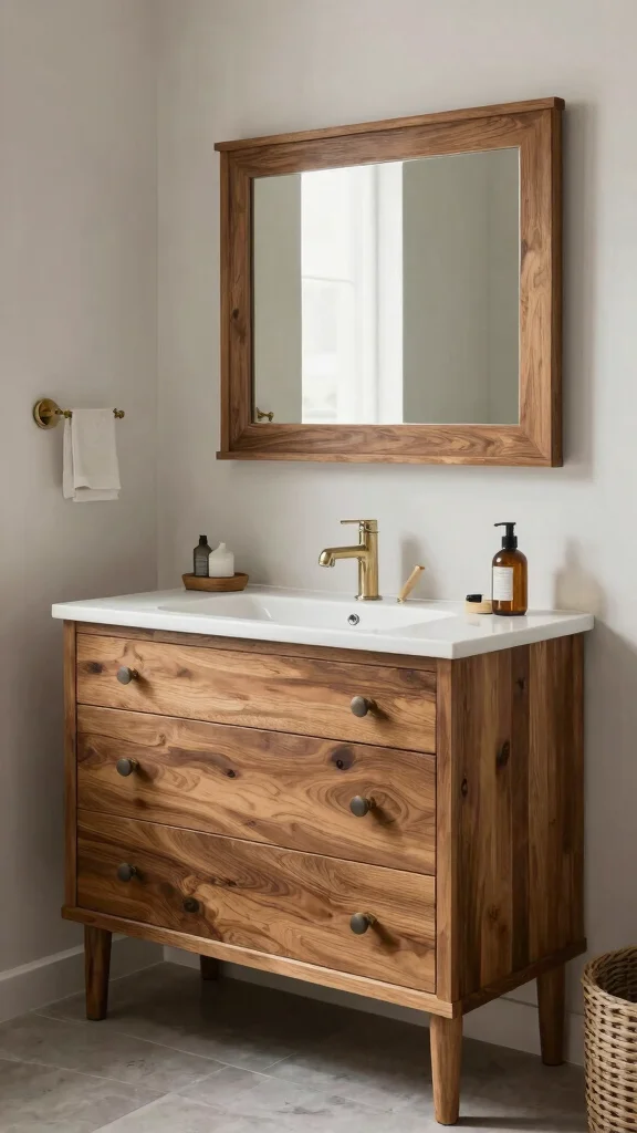 For those drawn to the industrial aesthetic, a wooden vanity with metal accents can create a striking look. The combination of steel or iron with warm wood introduces an edgy yet welcoming atmosphere to your bathroom. This design is especially effective in loft-style apartments or open floor plans, where a mix of textures can create a visually engaging contrast.