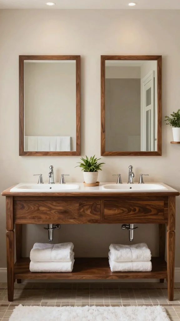 In larger bathrooms, a dual sink wooden vanity is a fantastic addition that enhances functionality and style. This setup allows multiple users to get ready simultaneously, making morning routines smoother for couples or families. Opt for a rustic wood finish paired with modern fixtures to create a beautiful contrast that serves as a centerpiece in your space.