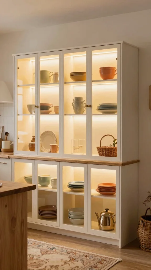 Lighted cabinets can transform your kitchen into an open, inviting space. By installing LED strips or small puck lights inside cabinets, you can illuminate your dishware and decor, turning ordinary cabinets into stunning features. This practical lighting solution not only aids in quickly finding items but also adds warmth and charm to your rustic design.