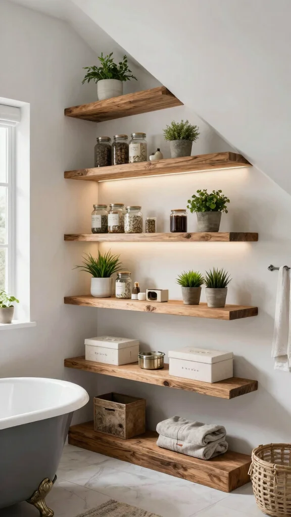 To enhance this idea, mix materials like wood and metal for a stylish industrial vibe. Consider accessorizing with small plants, aromatic candles, or decorative boxes to elevate the shelves into a captivating focal point. Playing with color and texture can add depth and interest to your bathroom decor.