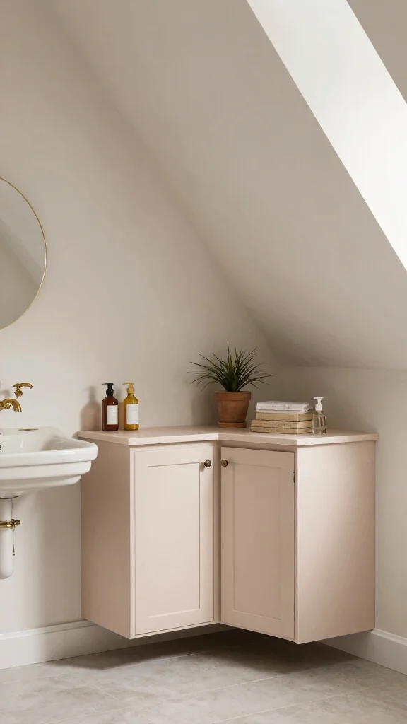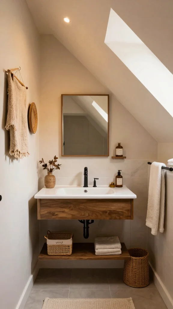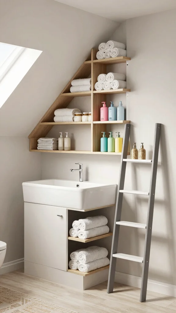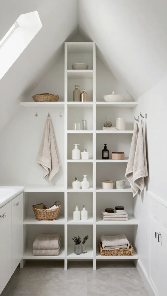 This approach brings functionality and style together, creating an organized yet inviting atmosphere in your attic bathroom.