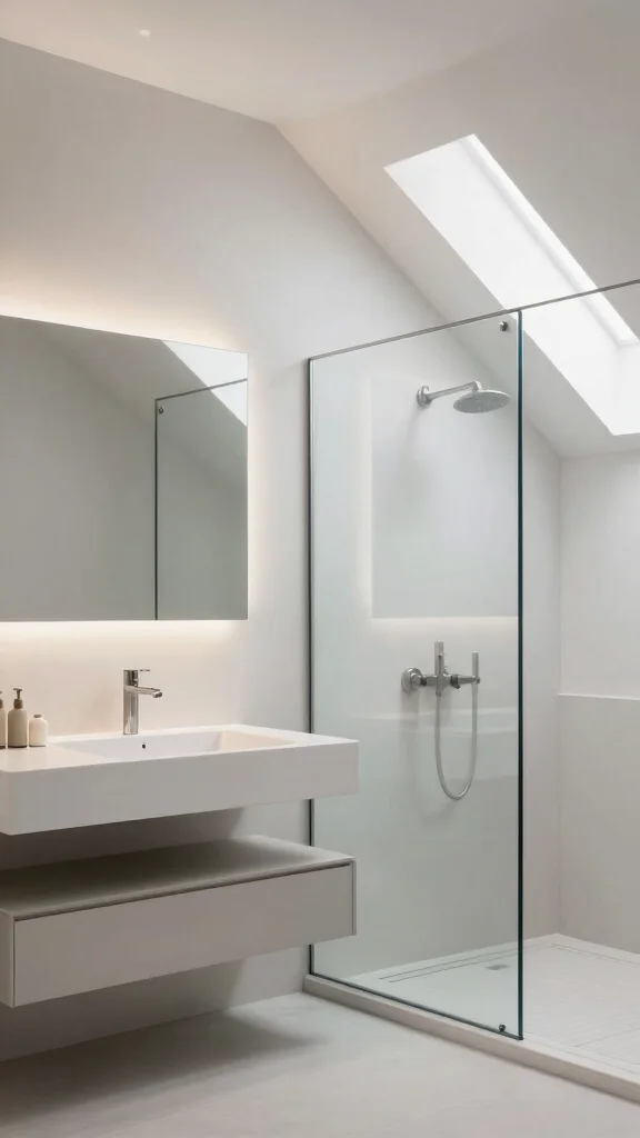 Consider a corner shower with a curved glass door under the slope, paired with a compact toilet under the peak area to maximize floor space. A wall-hung toilet with a concealed cistern reduces bulk and makes the room feel taller. Choose a floating vanity with integrated storage so the base stays clear. For lighting, use recessed LED lighting and a large mirror to bounce light. Add sloped ceiling decor like light panels or reflective tiles to emphasize height. These setups align with attic bathroom design principles and creative bathroom solutions for small spaces.