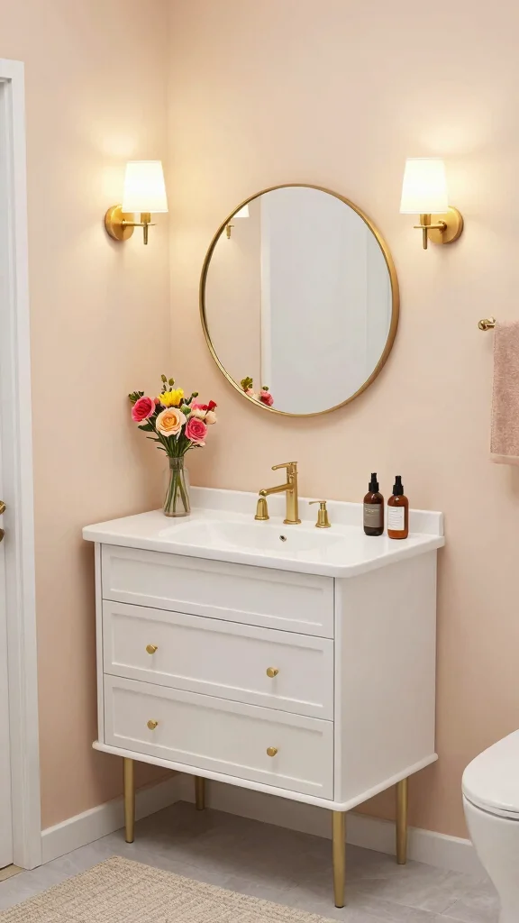 Choose vanities designed for small spaces, like wall-mounted or corner units with 18–22 inch depth. For glam bathroom decor, pair a sleek vanity with a statement mirror, metallic hardware, and a luxurious countertop. Add glass shelves or a slim open rack for display, and consider a plush, compact stool that tucks under the vanity. Use light-reflective surfaces—marble, glass, or high-gloss lacquer—to keep the room feeling airy. Finish the look with coordinated glam accents such as crystal knobs, soft towels, and a tasteful wallpaper or backsplash that enhances the vanity without crowding the space.