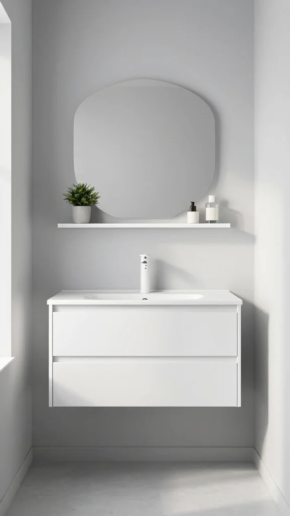 For a practical touch, select a floating vanity with built-in drawers to keep your beauty products hidden yet accessible. You can find affordable options made from laminate or MDF that mimic high-end materials. This design aligns perfectly with current trends toward open, minimalist spaces that evoke a sense of calm.