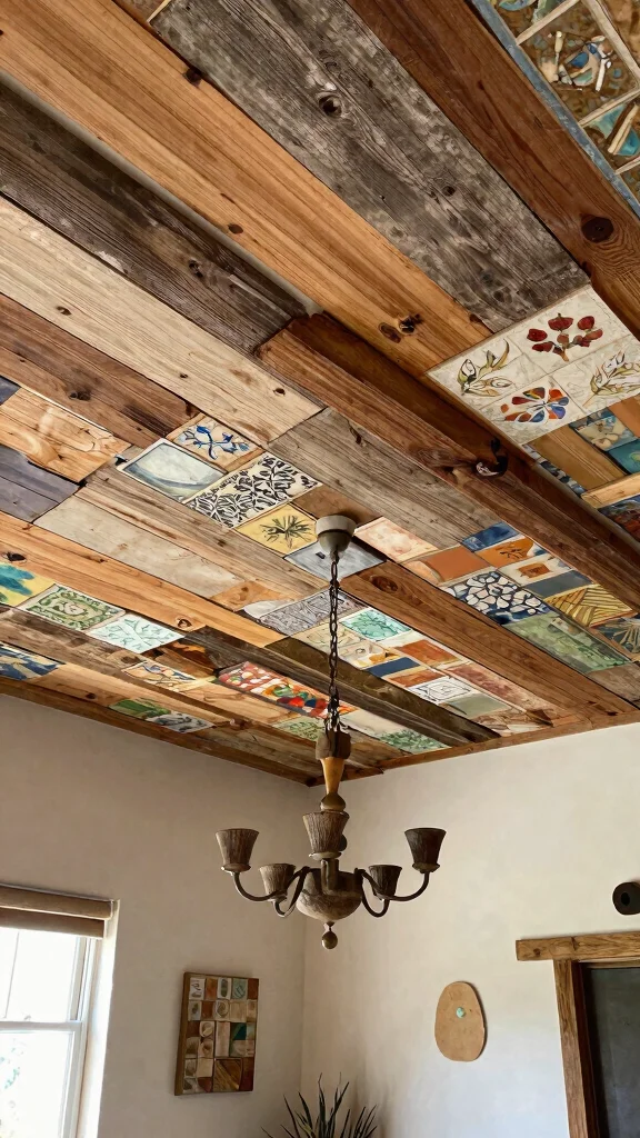 Unleash your creativity by using upcycled materials to craft a distinctive ceiling art piece. Whether employing old wood planks, vintage tiles, or reclaimed barn doors, the options are limitless. This approach not only adds character but also supports sustainability by recycling materials.
