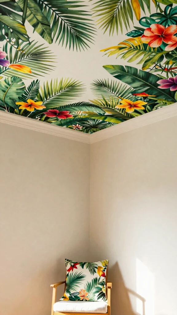 Imagine a ceiling mural that immerses you in a vibrant tropical paradise, filled with lush palm leaves and colorful flowers. This lively design can transform a compact area like a bathroom or reading nook into a joyful escape. Bright greens, yellows, and pinks create an inviting atmosphere, while varied shades of green add depth to the palm leaves. Floral patterns can pop beautifully against the greenery, bringing the tropics right into your home.