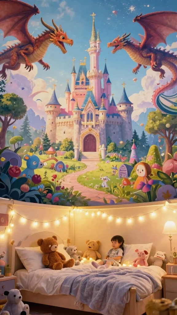 Bring enchantment to your child’s room with a captivating fairytale-themed ceiling mural. Imagine a ceiling adorned with castles, dragons, and magical creatures, transforming bedtime into an adventure. Soft pastels like lavender, pink, and sky blue create a whimsical ambiance, while elements like clouds, shooting stars, and fairy lights add an extra touch of magic. This mural can inspire creativity in children, becoming a cherished part of their imaginative world.
