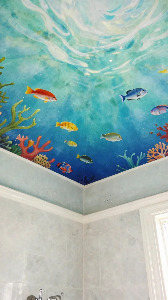Dive into an underwater adventure with a ceiling mural inspired by the ocean’s beauty. This fun design is especially suited for children’s rooms or bathrooms, where a playful aquatic theme can shine. Paint gentle waves in calming shades of blue, introducing charming sea creatures like dolphins, fish, and starfish for added whimsy. Light shades on the ceiling can mimic sunlight filtering through water, creating a sense of depth and spaciousness.