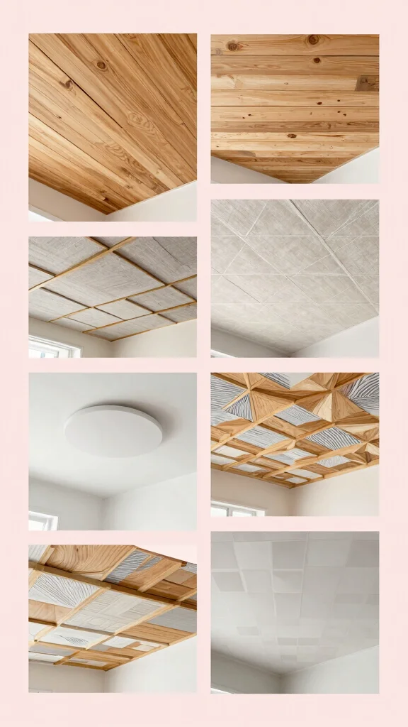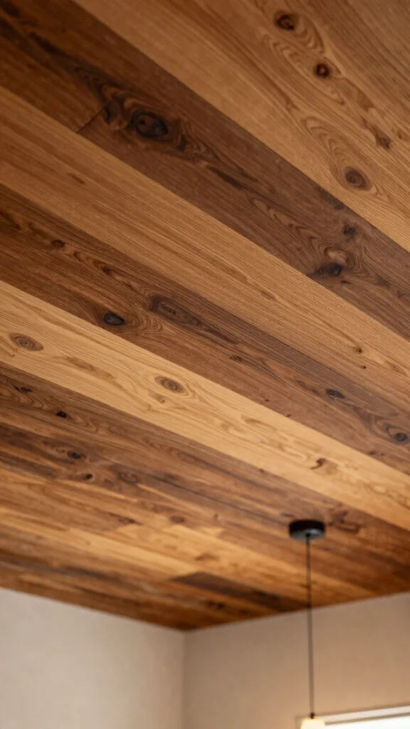 1) Reclaimed wood or wood veneer panels for warmth and sustainability, pairing well with modern ceiling designs and stylish ceiling treatments.