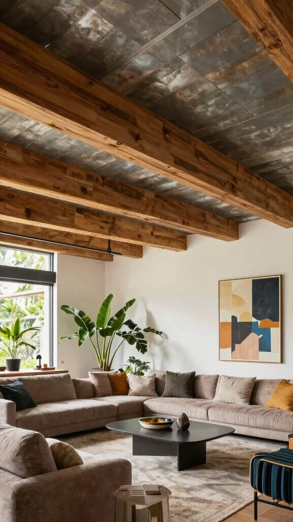 Imagine a rustic living room featuring dark beams that contrast beautifully with light walls, creating a dynamic look.