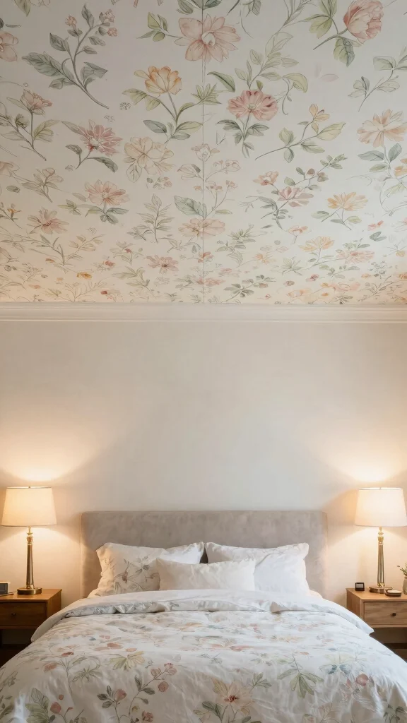 Picture a cozy bedroom with floral wallpaper on the ceiling, creating a sense of intimacy and charm.