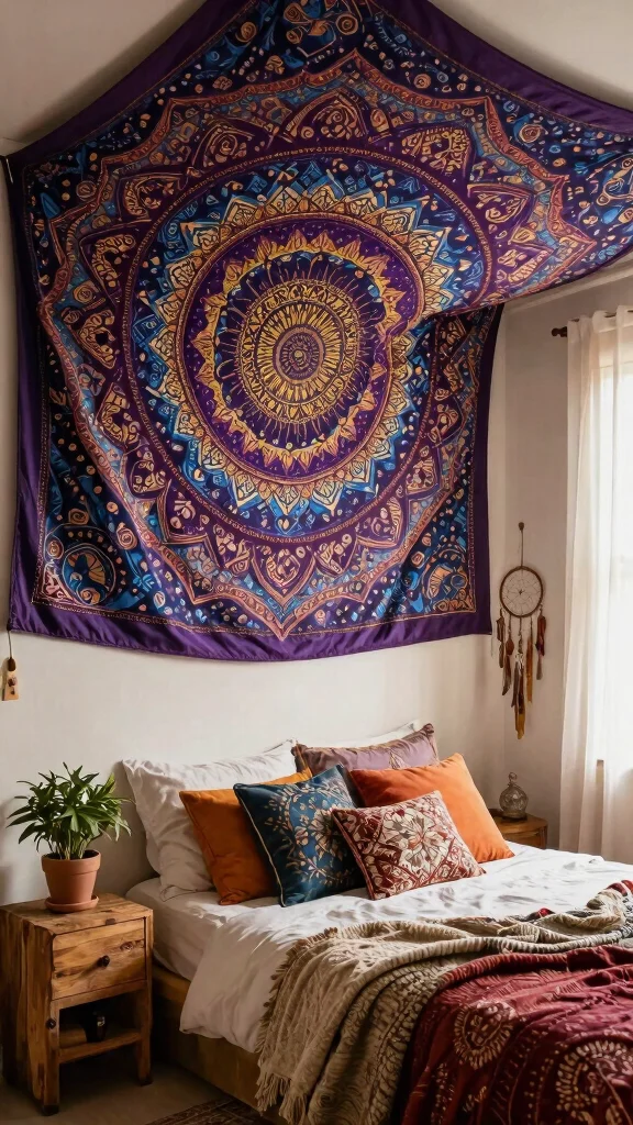 Incorporate mandala tapestries for a meditative and artistic touch, enhancing your space’s visual appeal.
