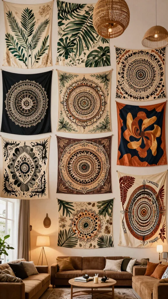 Hanging a mandala tapestry above your bed or on a feature wall can create a striking focal point. For a layered effect, pair them with soft textiles like flowy curtains and plush bedding that enhance the bohemian vibe.