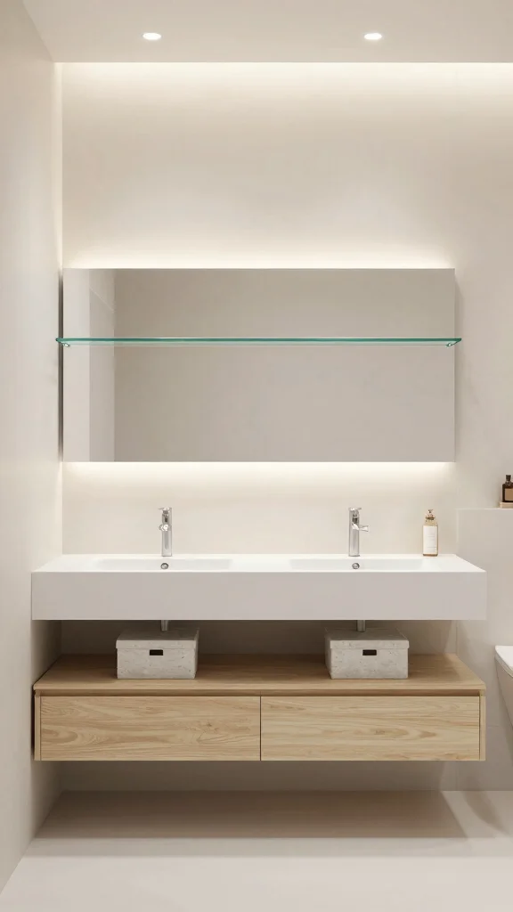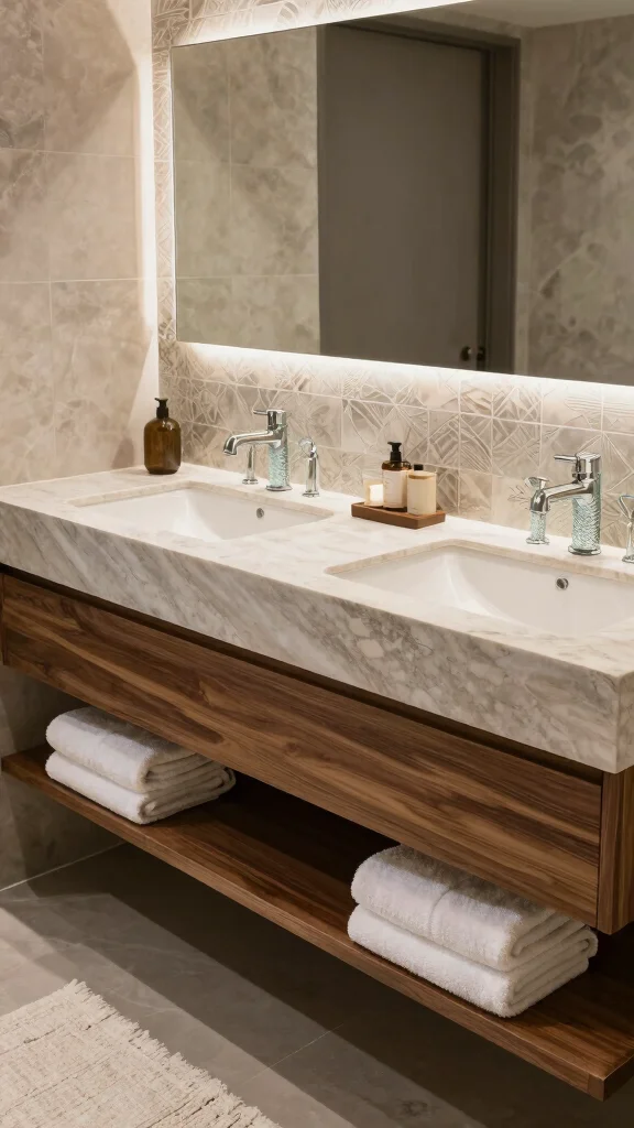 To maximize this stunning effect, consider under-mount sinks for a streamlined look. Pair these with brushed gold or chrome hardware to enhance the elegance further. Incorporating open shelving beneath the vanity is an excellent way to blend style with functionality, providing easy access to towels and decorative storage options.