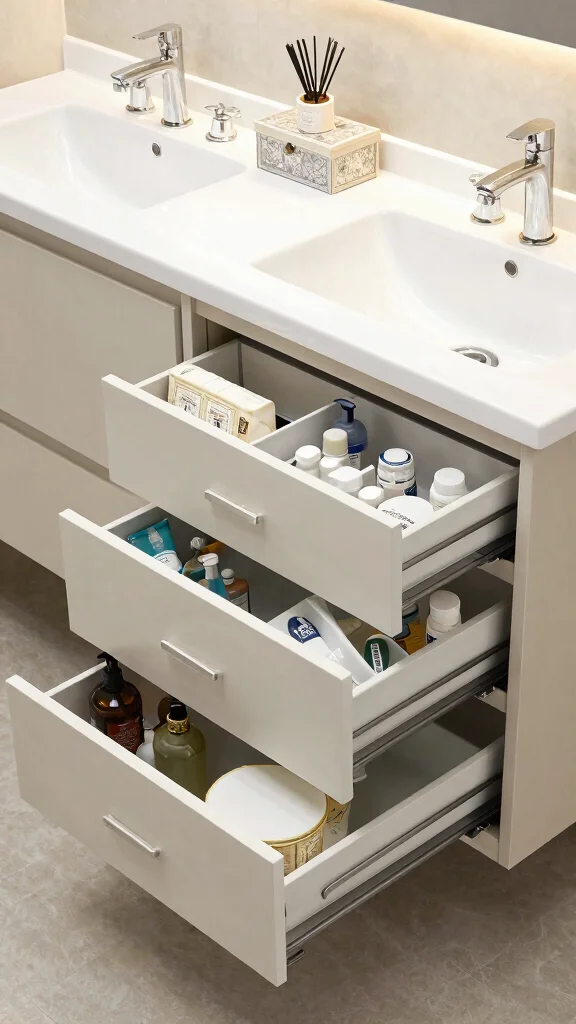 A double bathroom vanity can be both beautiful and functional with personalized storage solutions. Custom drawers and divided compartments help organize bathroom essentials effectively. Think about incorporating pull-out baskets or built-in dividers tailored to your specific needs.