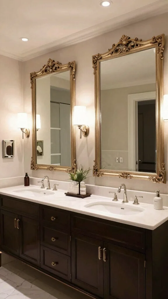 A double bathroom vanity can be dramatically enhanced with glamorous mirrors that elevate the space’s overall elegance. Opt for oversized or uniquely shaped mirrors that serve as statement pieces, adding depth to your bathroom design. Mirrors with ornate frames or built-in lighting can create an added sense of drama and sophistication.