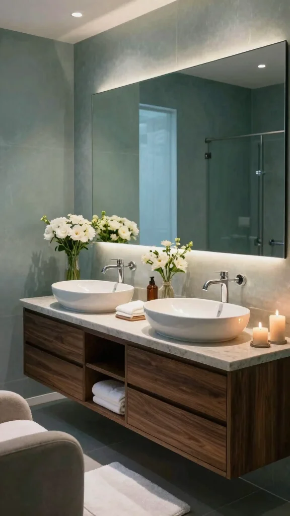 Transform your bathroom into a luxurious spa retreat with a double vanity that radiates relaxation. Rich materials like dark wood or deep-colored stone paired with high-end fixtures create an atmosphere of opulence. A large vessel sink becomes a stunning focal point, enhancing your daily bathroom experience.