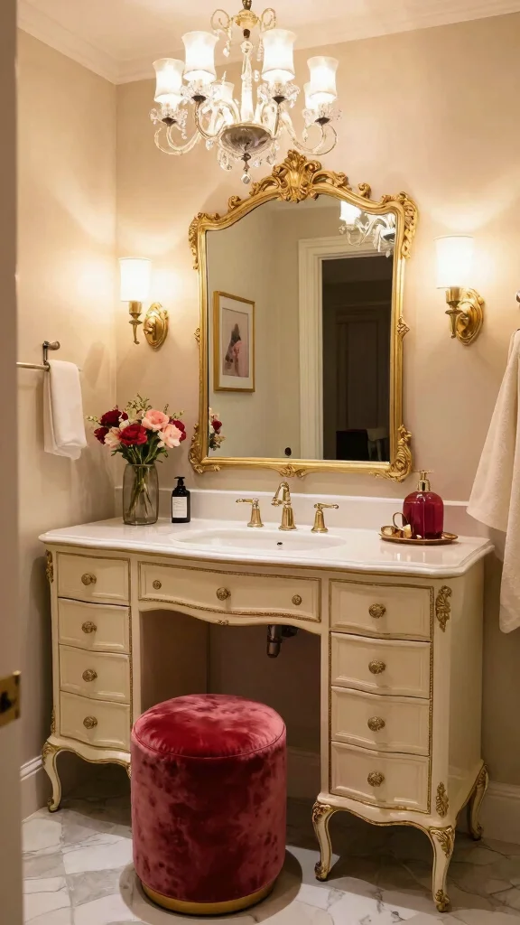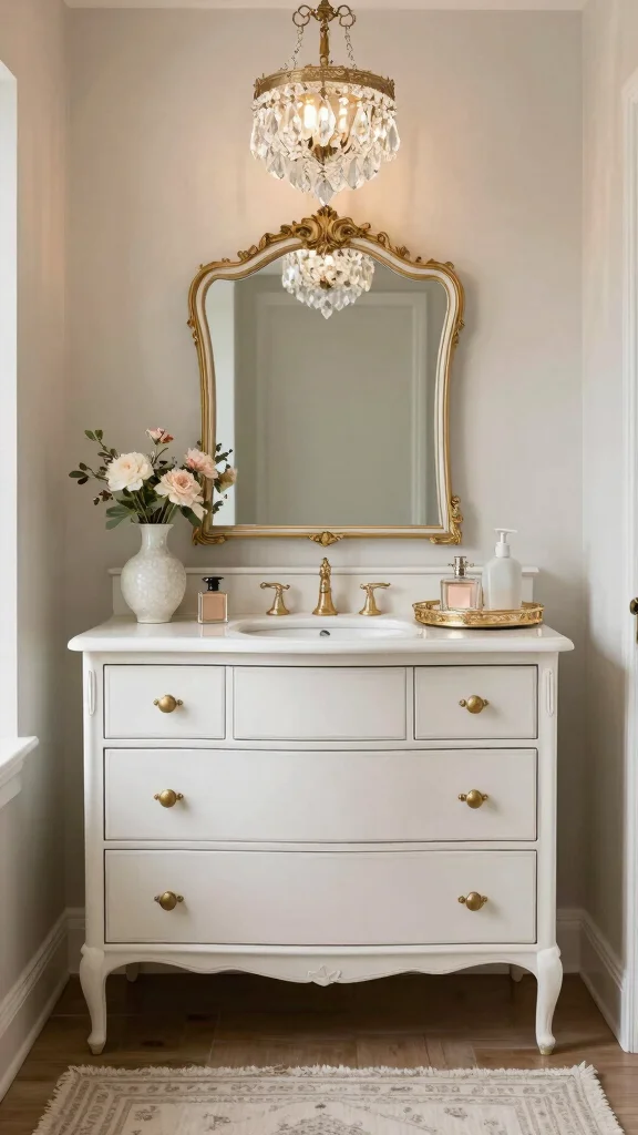 Bring Parisian charm into your bathroom with a cream-painted dresser vanity and delicate gold accents. Small details matter: a vintage mirror, soft colors, and fresh florals elevate the space without shouting.
