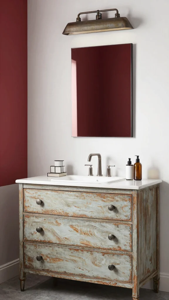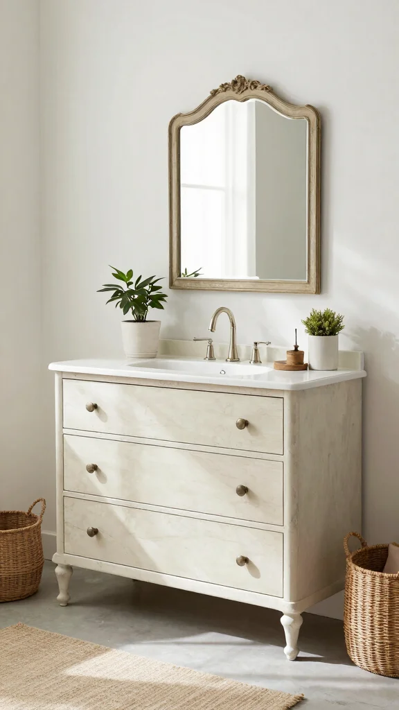 A dresser vanity bathroom setup instantly becomes the focal point and adds a unique vintage touch. Start with a sturdy dresser that has enough drawer space, then install a sink and faucet in a style that matches the era you love. Choose a finish that complements your tile and mirror, or paint it in a soft antique hue for authentic vintage bathroom decor. Add a framed mirror, warm lighting, and vintage hardware to realize unique dresser designs that feel cohesive with the rest of the room. Finish with rustic accents—linen storage, brass accessories, and a cozy rug—for actionable bathroom styling tips.