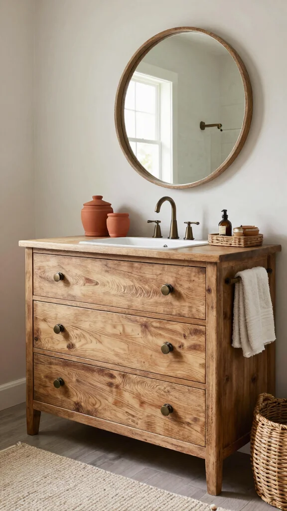 Embracing the beauty of natural materials, rustic elegance in a dresser vanity creates a warm, inviting atmosphere. A dresser crafted from reclaimed wood showcases its unique textures, while vintage-inspired fixtures, like bronze hardware or ceramic sinks, enhance the rustic vibe beautifully. A large, round mirror framed in reclaimed wood serves as a stunning focal point, reflecting light and inviting warmth throughout the space.