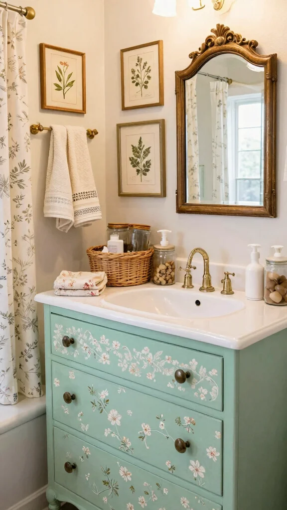 For a delightful cottage charm, a vintage dresser vanity can beautifully set the tone for your bathroom. Picture a dresser adorned with a floral-patterned finish that radiates warmth and comfort. Soft colors like mint green or pale yellow mimic the quaint feel of a countryside home, while layered framed botanical prints and vintage mirrors enhance the overall cottage aesthetic.