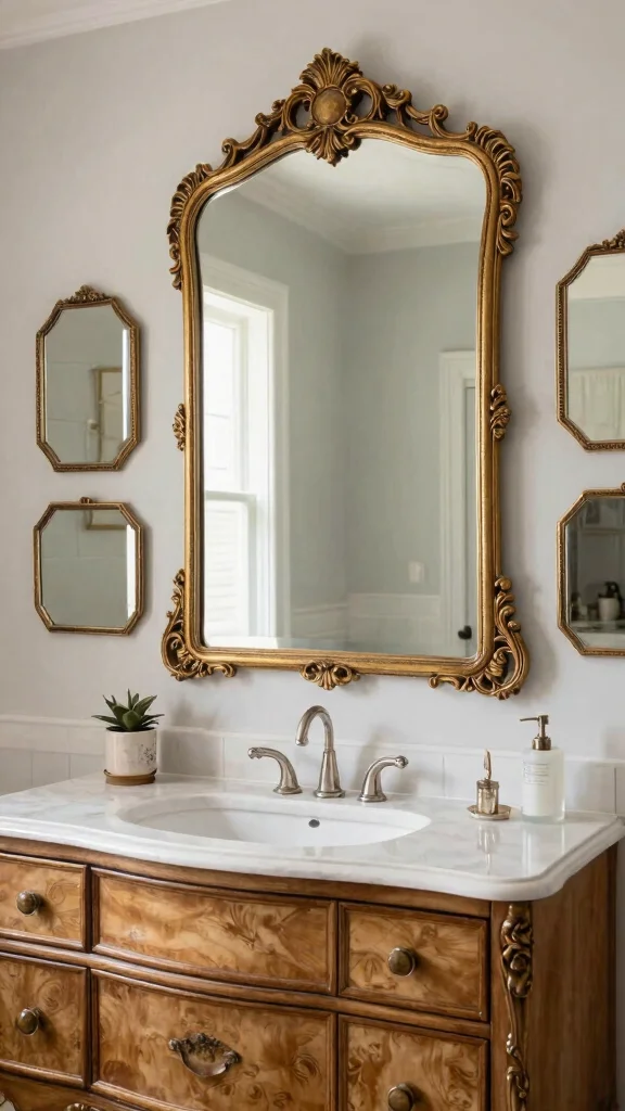 Mirrors play a crucial role in bathroom decor, and a vintage dresser vanity paired with a stunning mirror can remarkably elevate the space. Choose a dresser with an antique finish to complement an oversized mirror adorned with ornate detailing. This combination not only adds depth to your bathroom but also enhances the vintage charm, making the space feel more expansive.