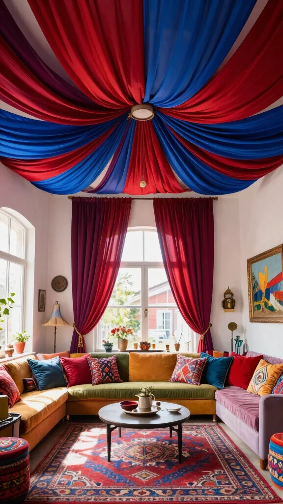 Incorporate vibrant drapes to create a lively atmosphere and enhance the visual appeal of your ceiling.