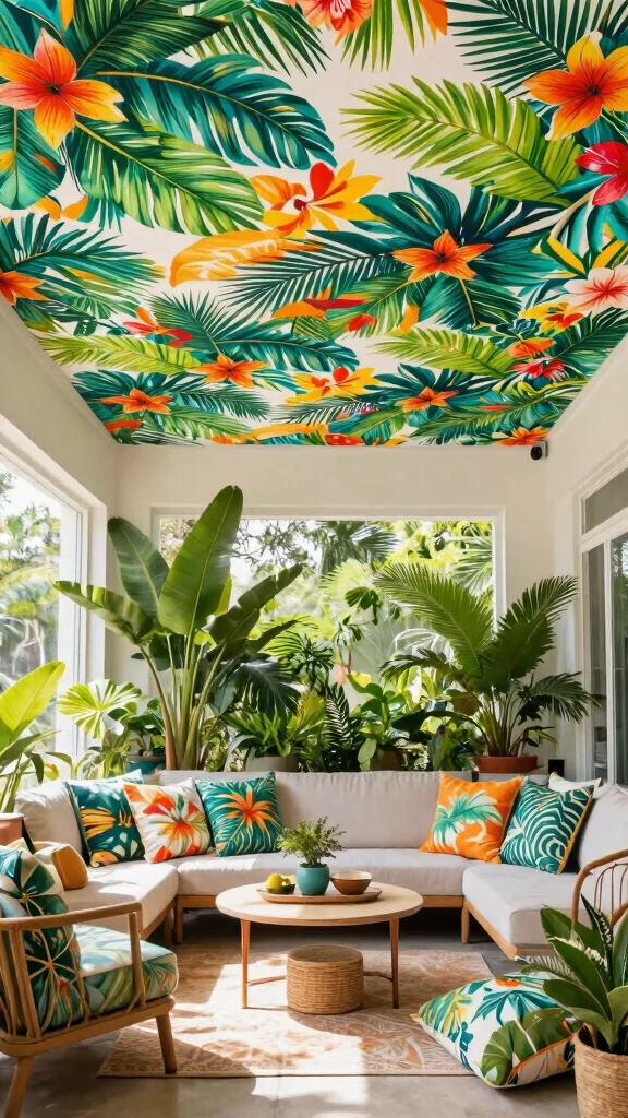 If you want to make a striking statement, bold tropical prints on your ceiling can bring a lively vacation vibe to your home. Large, colorful patterns featuring palm leaves or florals create an exotic atmosphere, perfect for sunrooms or leisure areas.