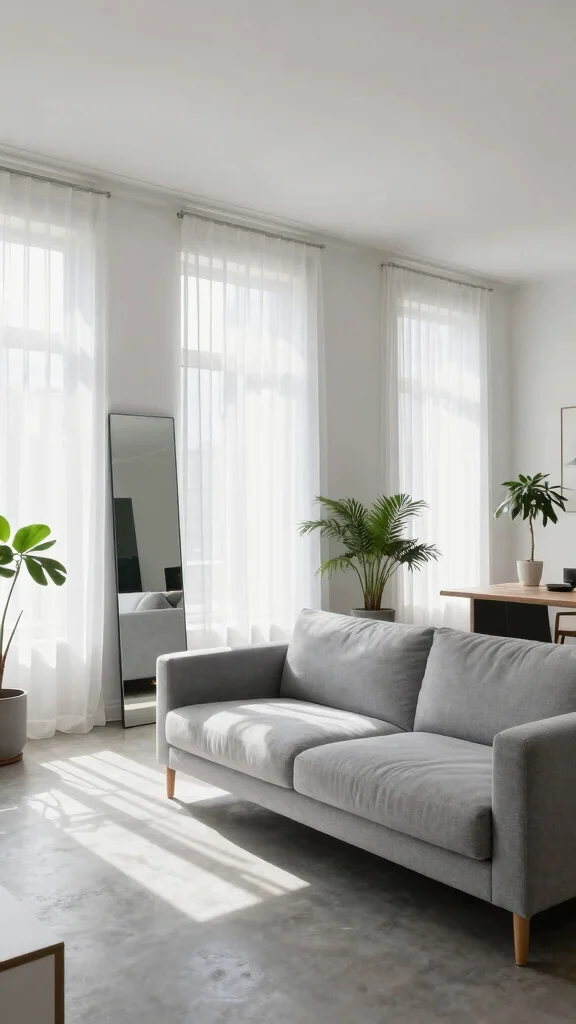 Utilize sheer curtains to maintain privacy while allowing light to filter through. Strategically placing mirrors can amplify the light and create a sense of openness, connecting with the minimalist principle of simplicity and clarity.