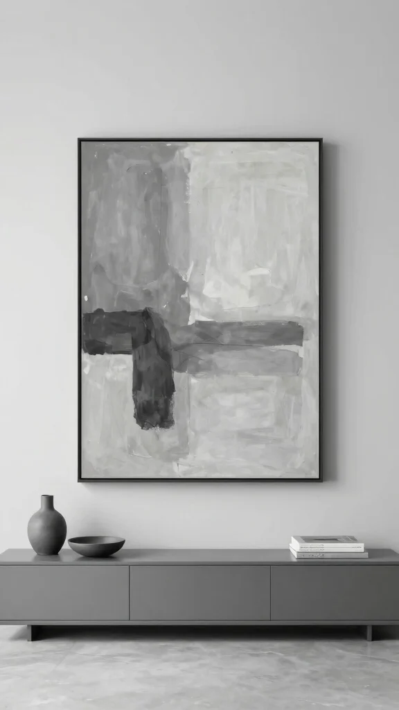 Art plays an essential role in a minimalist living room, even within a grey palette. Opt for large-scale pieces that make a statement without overwhelming the space. This artful minimalism can add personality while adhering to the core principles of simplicity.