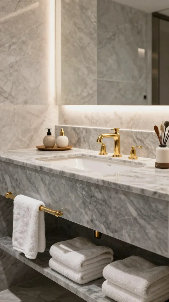 This design elevates your bathroom’s aesthetic while making it more functional. The interplay of textures, like the smooth vanity surface and soft lighting, enhances the overall feel of the space.