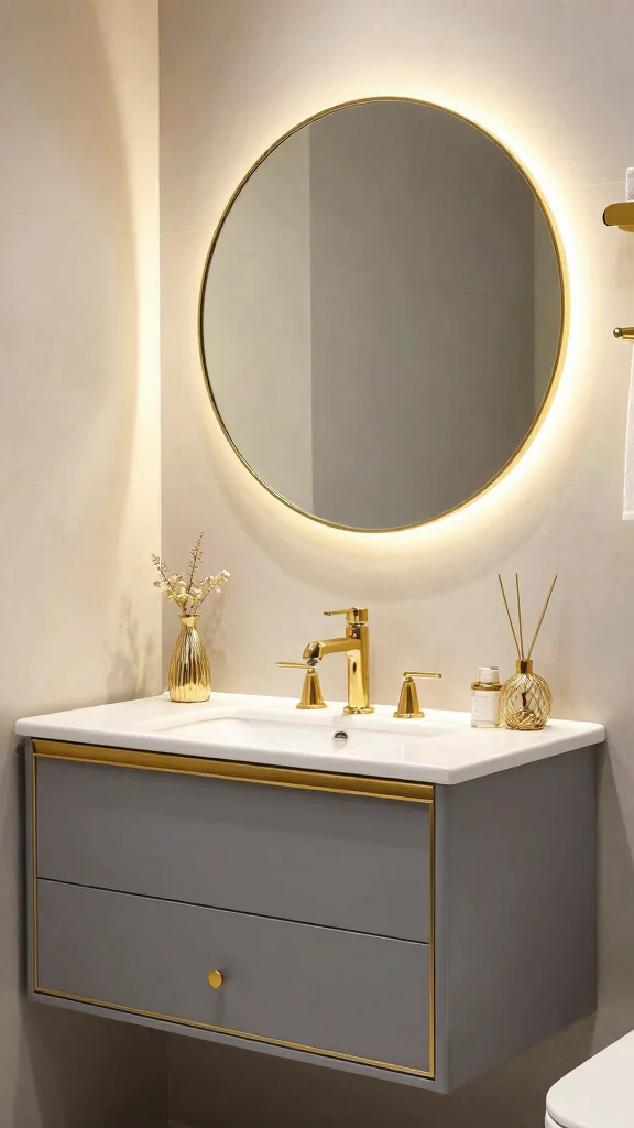Use glamorous gold accents to elevate the sophistication of your grey vanity bathroom design.