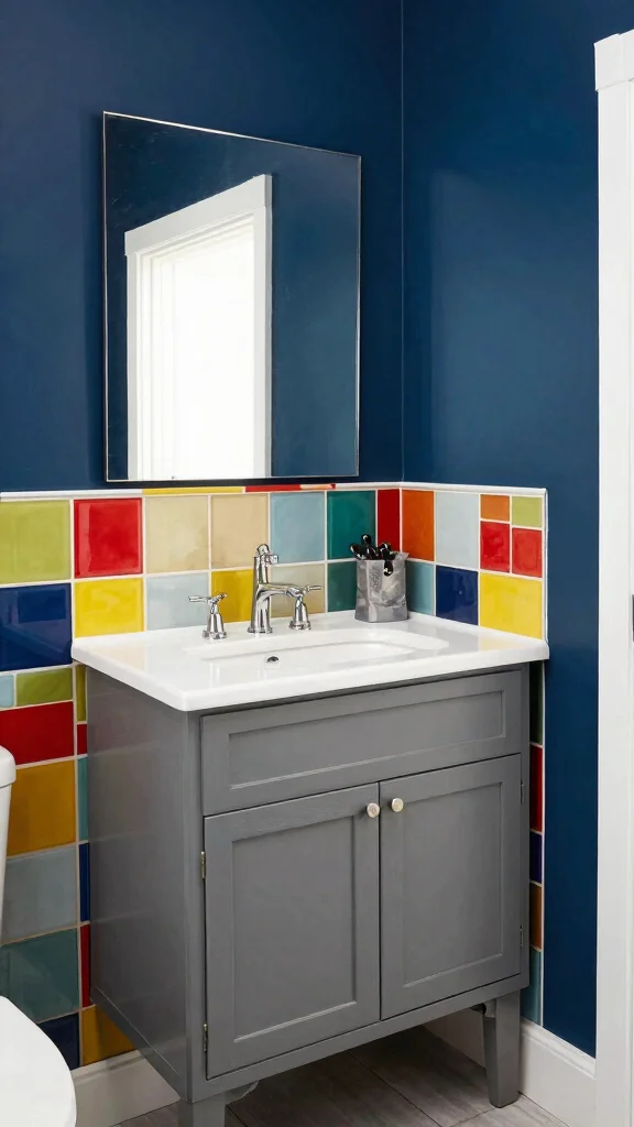 This choice makes your bathroom a true reflection of your style. The interplay between the grey and bold colors creates a dynamic space that feels lively and inviting.