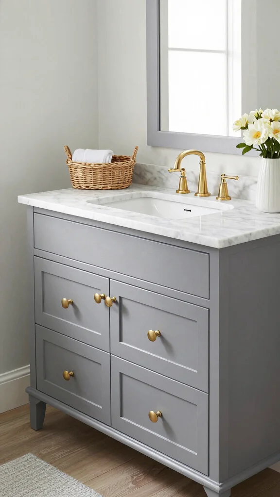 Start with a budget-friendly refresh: repaint an existing vanity in a grey shade, swap old hardware for a modern satin nickel, and install a new faucet to dramatically update the space.