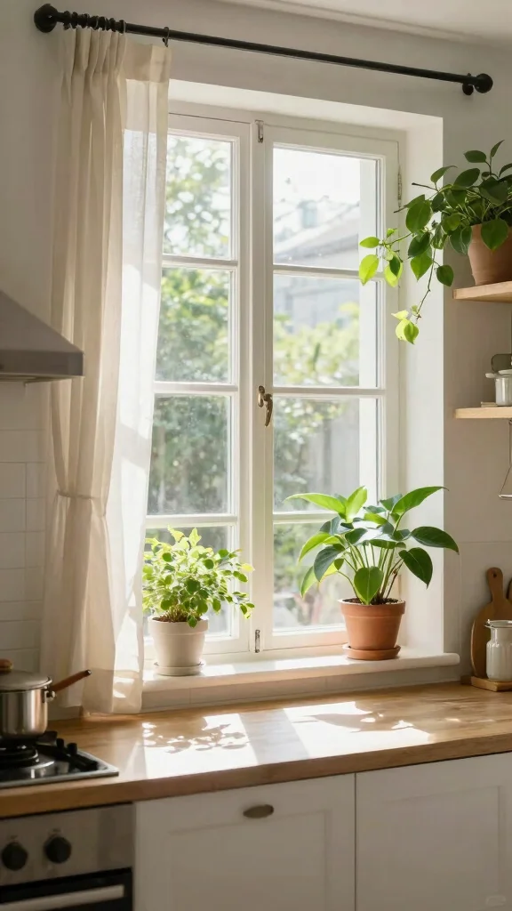 To enhance natural light, use sheer curtains that filter light while maintaining privacy. Strategically positioned mirrors can reflect light throughout the room, amplifying brightness. Keeping your windows clean ensures that light flows freely into the space, enhancing the kitchen’s openness.