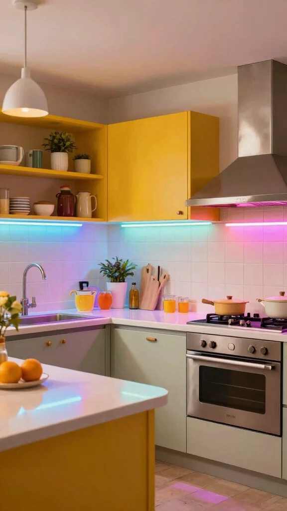 Bright and colorful accent lighting can infuse your low-ceiling kitchen with personality and flair. This fun lighting option adds playful elements that enhance the overall decor and create a vibrant atmosphere. Using colored lights strategically can transform your kitchen into an inviting space perfect for gatherings.