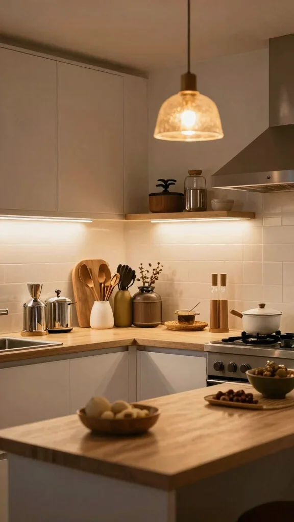 – Use a mix of recessed lights, pendants, and under-cabinet lighting for variety.