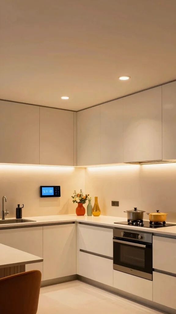 Group fixtures into zones (perimeter vs island) and control them separately to fine-tune the mood while preserving a clean, modern kitchen decor.