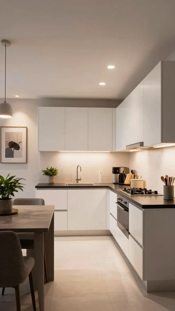 Keep a consistent color temperature across fixtures to maintain a cohesive modern kitchen decor and use dimmers to fine-tune ambient kitchen lighting and lighting layout tips.