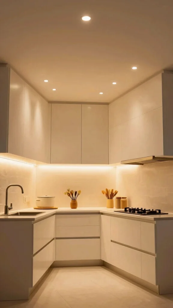 To make the most of this design, consider spacing your lights about 3-4 feet apart for even lighting. Opt for dimmable recessed lights to easily adjust the ambiance, and combine them with under-cabinet options to introduce depth and warmth.