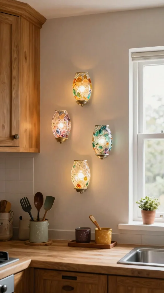 Bright mosaic wall fixtures not only illuminate your kitchen but also serve as eye-catching decorative art pieces. Made from colorful materials, these fixtures can reflect your personality and style while enhancing the overall design. Their unique designs add vibrancy and playfulness to your kitchen space.