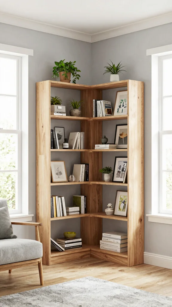 Make the most of your living room’s often-overlooked corners with stylish corner shelving units. These units can fit snugly into corners while providing ample storage for books, plants, or decorative pieces, helping to keep your floor clear. They add visual height and interest to your space, complementing your decor style beautifully.