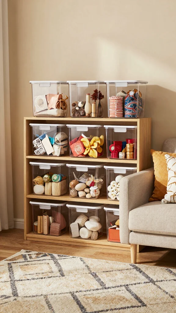 Clear storage containers offer a practical and visually appealing method to keep your living room organized. They make it easy to see contents at a glance, whether placed on shelves, under sofas, or in cabinets. Select high-quality, stackable clear boxes to optimize vertical space and maintain a clutter-free environment.