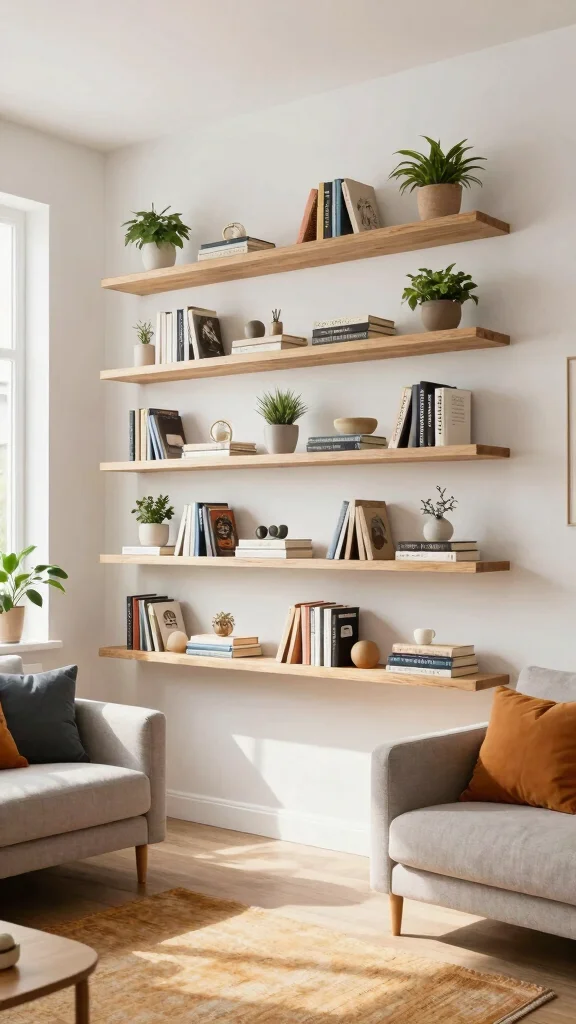 Embrace the vertical space in your living room with wall-mounted shelving that combines functionality with modern design. These shelves can showcase books, plants, and decorative items, keeping your floor clear and creating an open atmosphere. You can personalize them to match your style, choosing between airy open shelving or sleek closed cabinets that blend seamlessly with your decor. This organization technique allows you to display cherished items while maintaining a tidy environment.