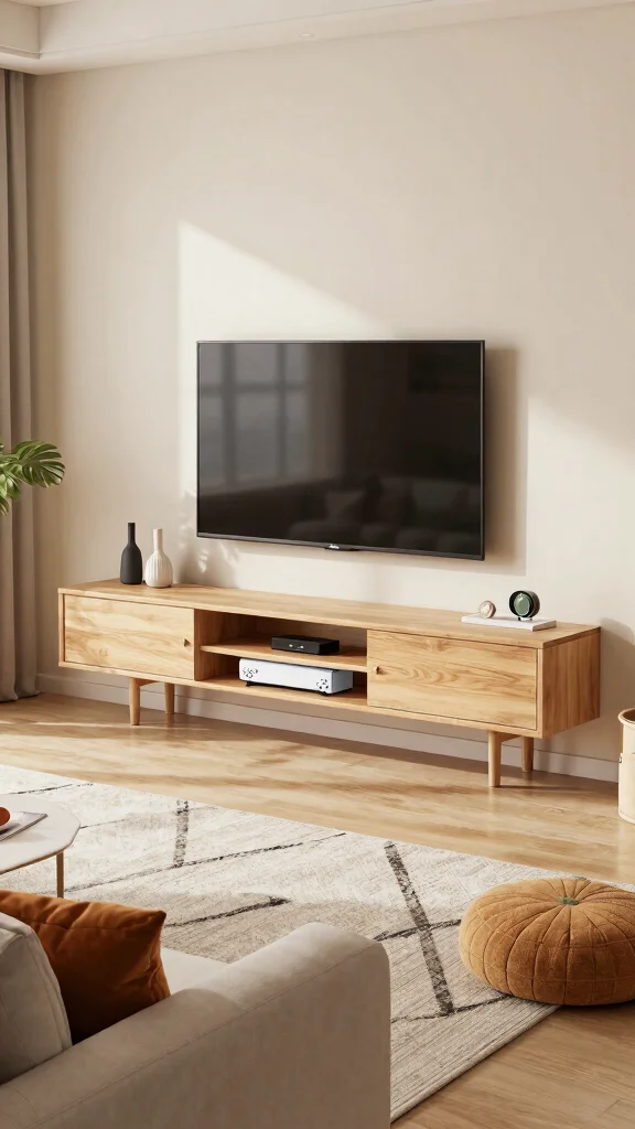 A floating TV stand is a stylish and modern solution for organizing your media area while saving valuable floor space. These stands create a sleek, contemporary look that elevates your living room design. You can choose the height for installation, allowing for extra storage underneath for gaming consoles or decorative accents.